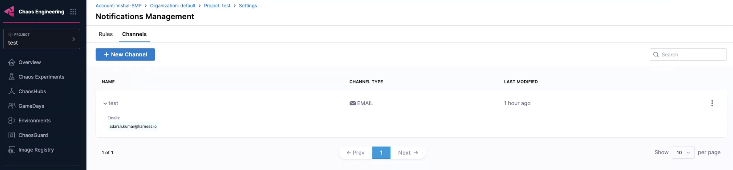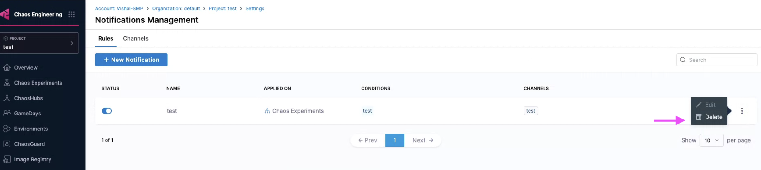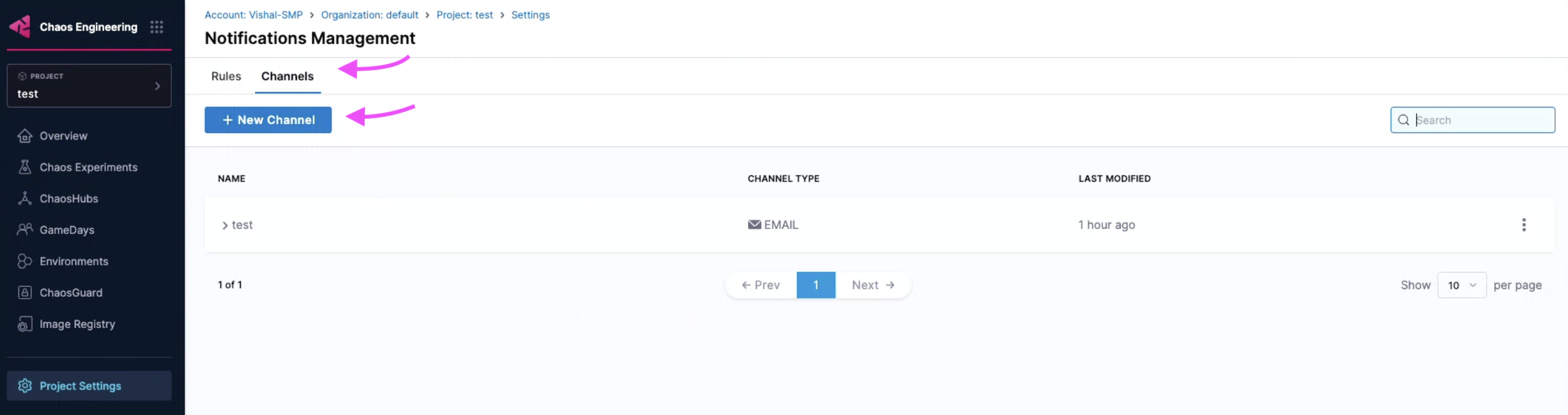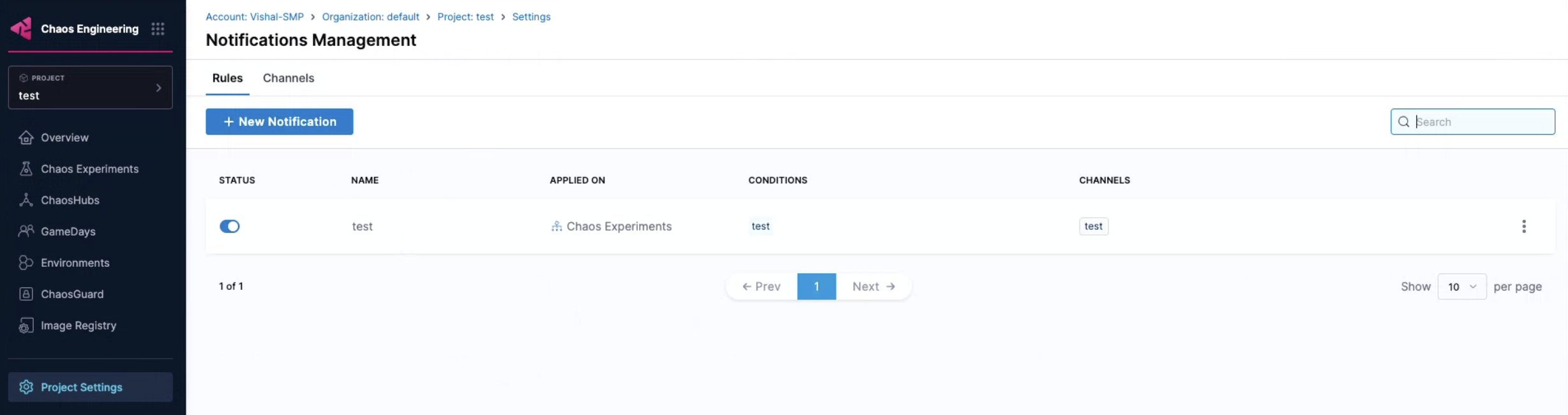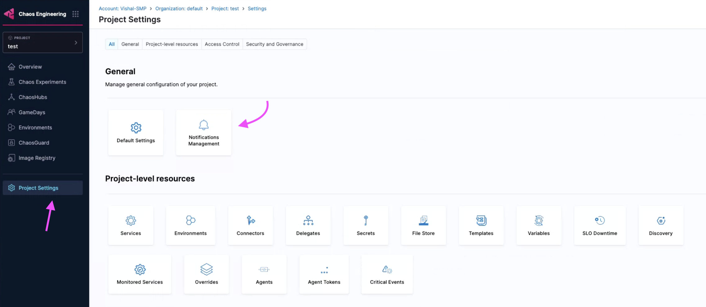 Navigate to Chaos Engineering module. Select Project Settings and then Notifications Management.