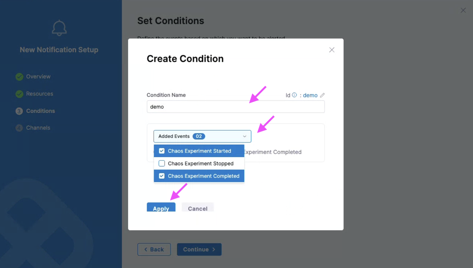 Provide a Condition Name, select the events (such as chaos experiment started, stopped, or completed) for which you want to receive the alerts. Select Apply.