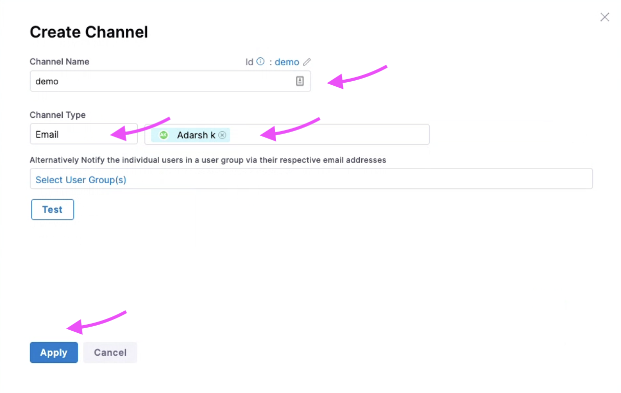 Enter a Channel Name, select Channel Type (currently supports email only), and provide the associated value for channel type (email in this case). Select Apply.