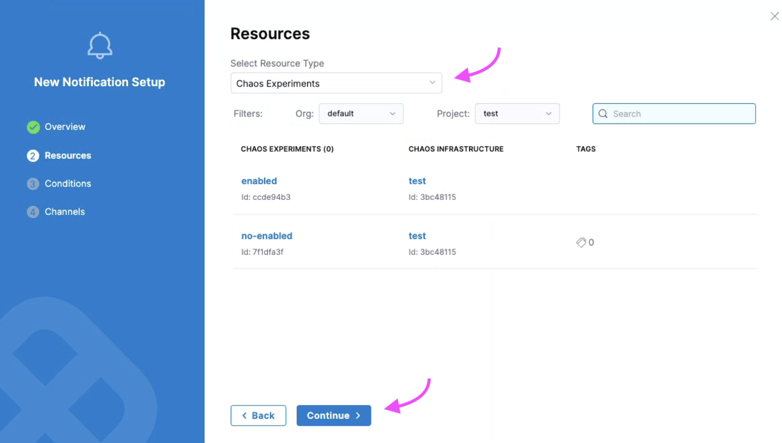 Enter a Notification Name and select Continue. Select Chaos Experiments as Resource Type because HCE currently supports alerting for chaos experiments only. Click Continue.