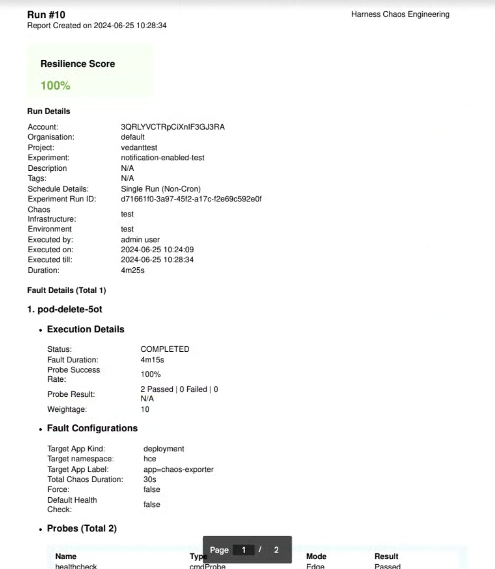 Alerts provide the status of the chaos experiments and other details, including run details, fault configurations, probes used, and so on). These updates can be valuable for making informed business decisions and serve as historical data for previous experiment runs.