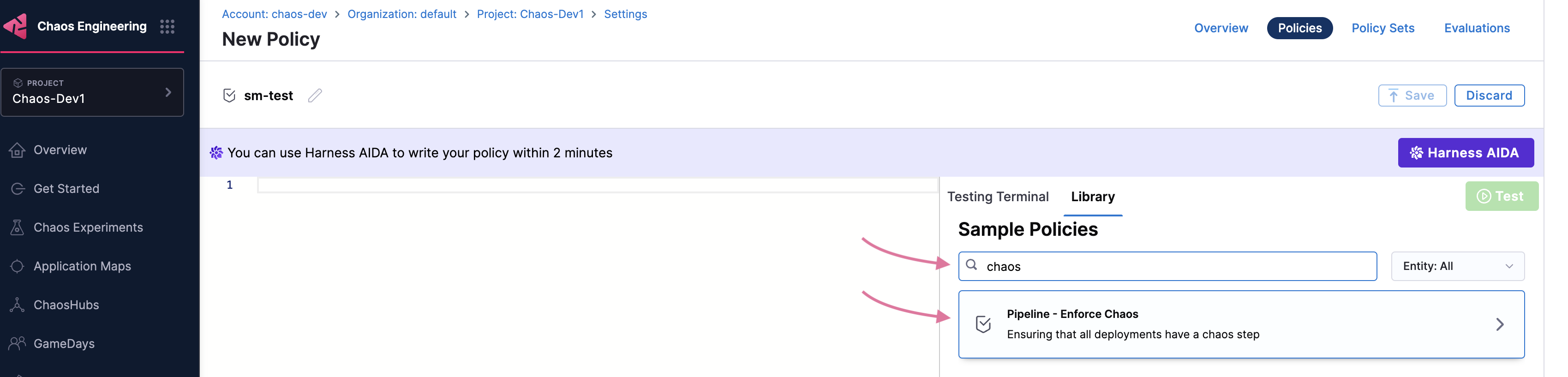 2. In the Sample Policies field, search for chaos and select the Pipeline- enforce chaos option. Select Use This Sample. The template provides fields such as experimentRef (takes the experiment ID), expectedResilienceScore, failureStrategies, and so on. Provide the relevant values for these fields. Click Save.