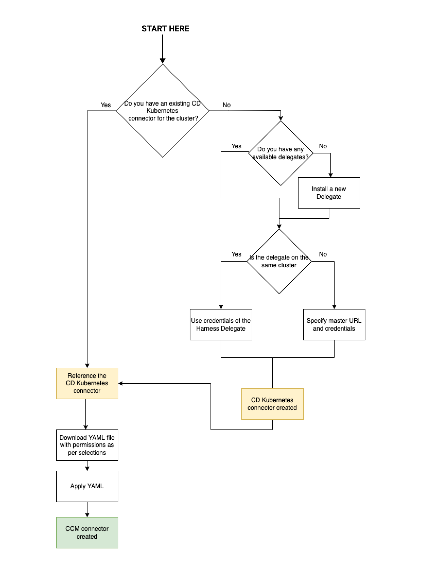 - Create a Harness CCM Kubernetes connector that targets the Kubernetes connector. This enables the delegate to start collecting usage metrics to be sent back to Harness for use in CCM.