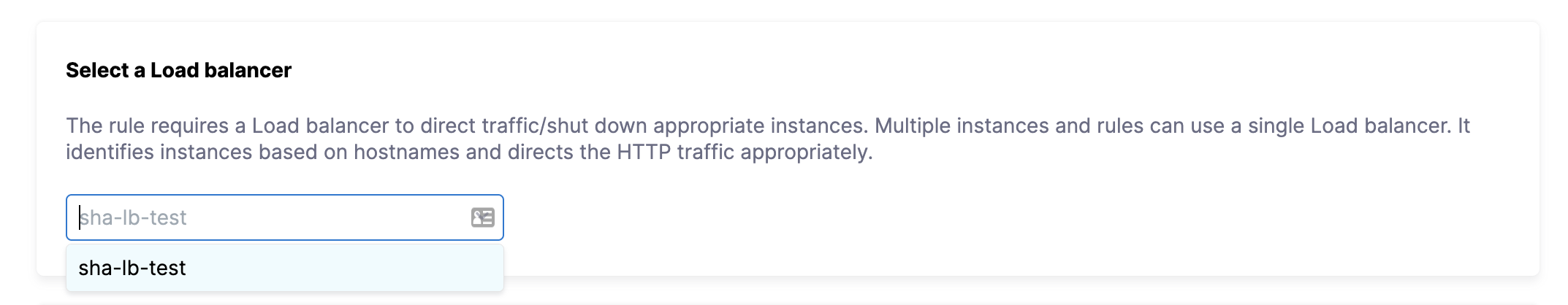 - Select a Load Balancer: The rule requires a load balancer to detect traffic and shut down appropriate instances. Multiple instances and rules can use a single load balancer. It identifies instances based on hostnames and directs the HTTP traffic appropriately.