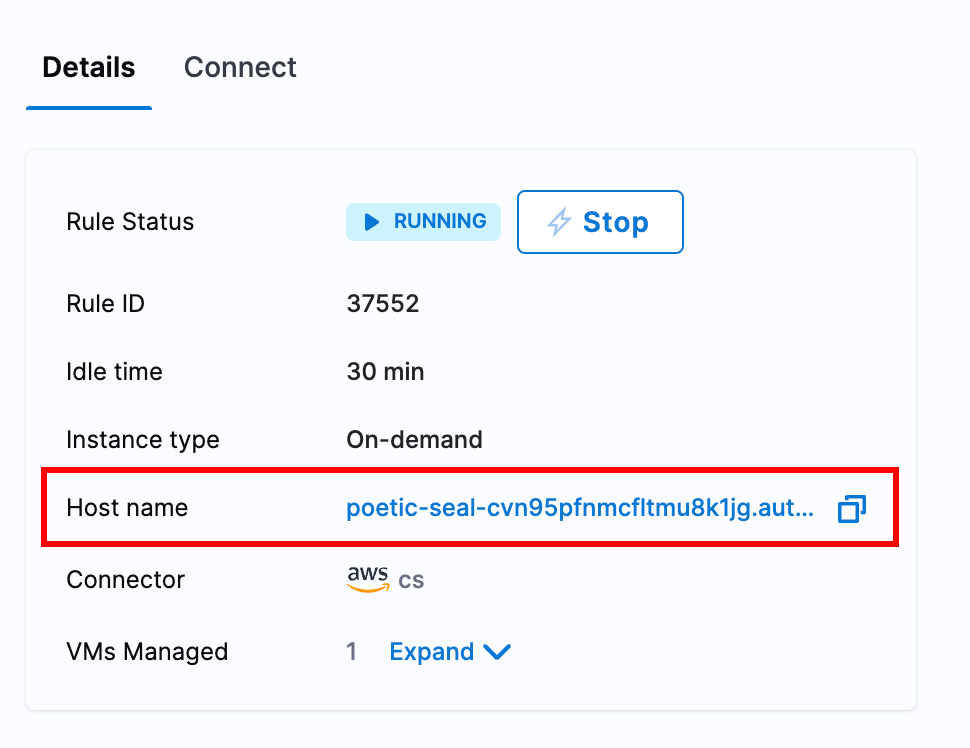 Hostname of the AutoStopping Rule: Hostname of the AutoStopping Rule for which you want to configure the ECG. You can copy the hostname from the AutoStopping dashboard. To obtain the hostname, do the following: - In AutoStopping Rules, in Summary of Rules, click the rule for which you want to configure the ECG.