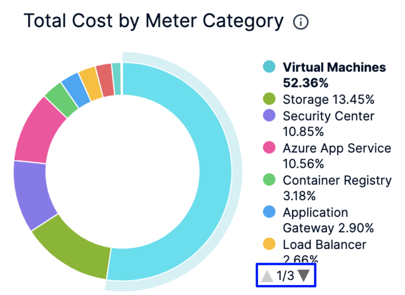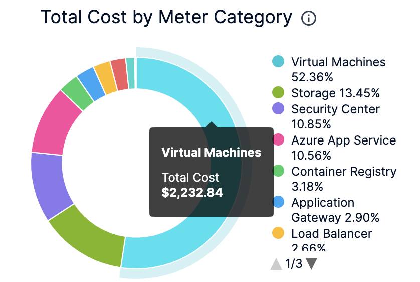 In the Cost by Meter Category and Total Cost by Region click the up or down arrow button to scroll up or down the list. The list shows the percentage of each meter category with respect to the cost contribution.