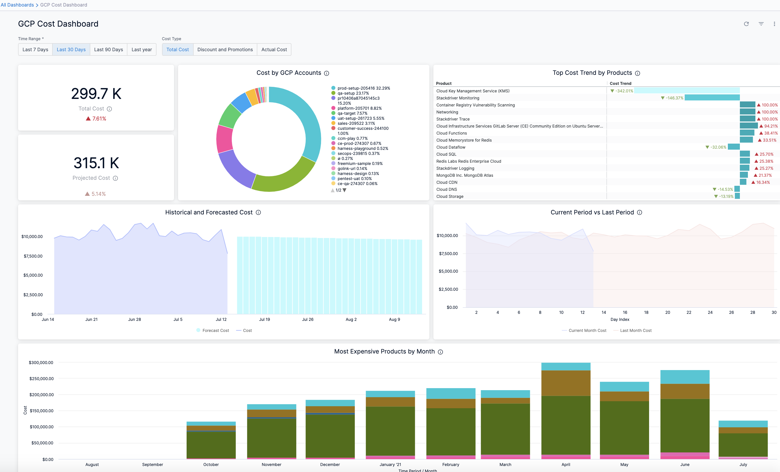 Harness provides By Harness (pre-defined) and Custom (user-defined) Dashboards to visualize cloud cost data across clusters and cloud accounts. Using the GCP Cost Dashboard you can: