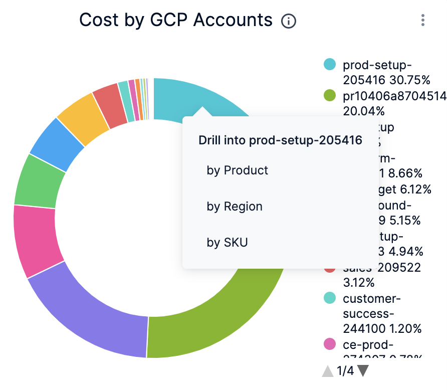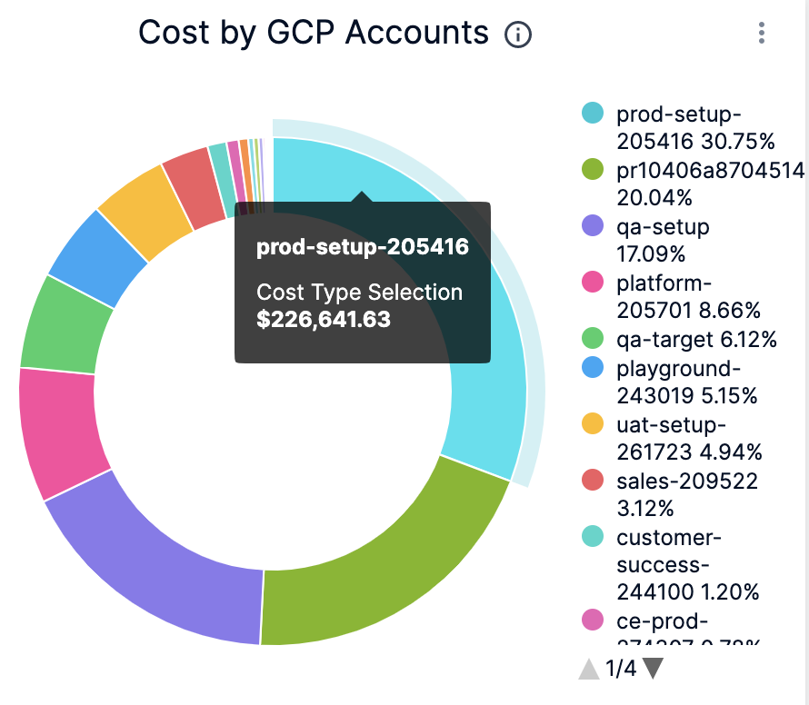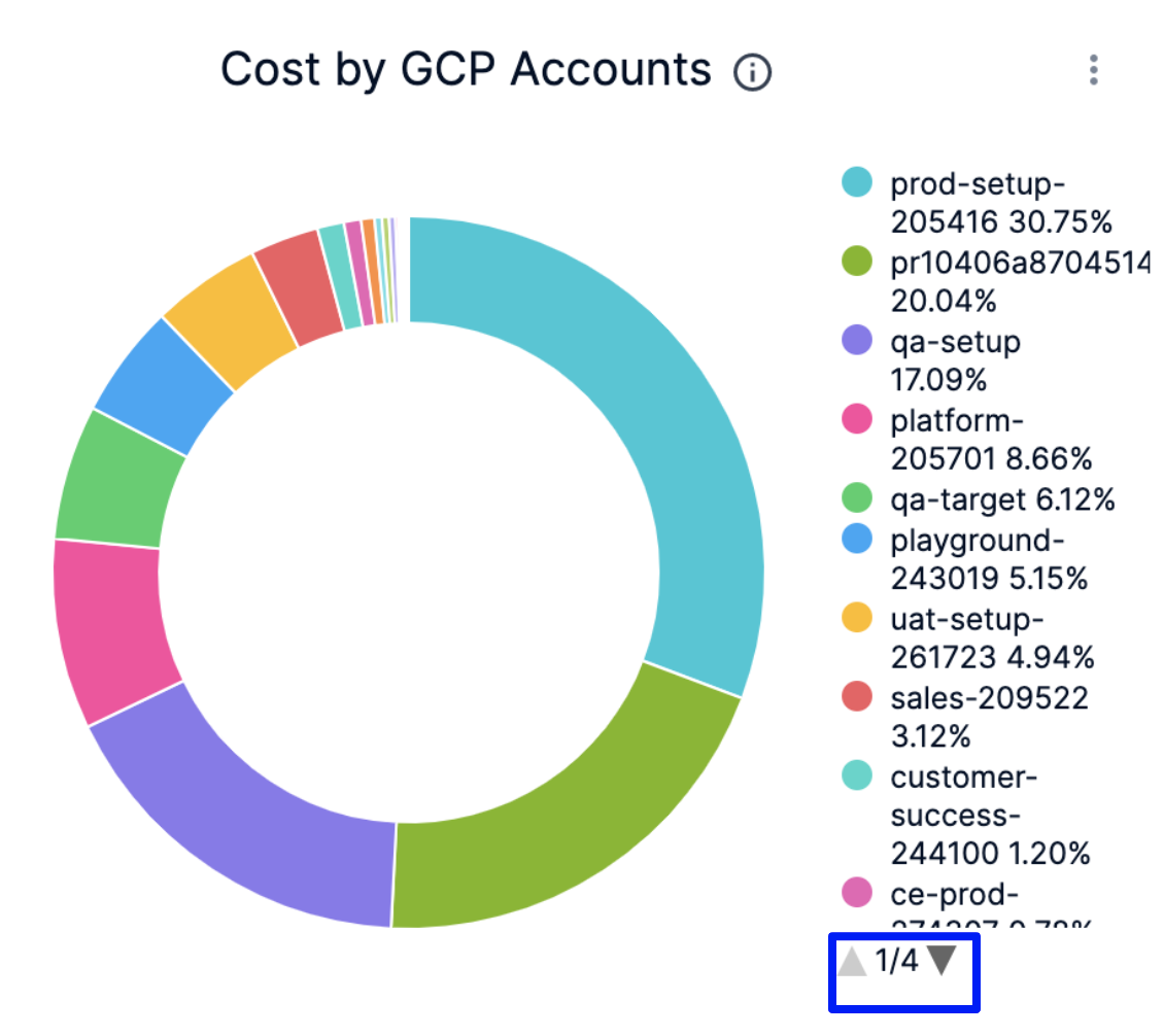 In Cost by GCP Accounts, click the up or down arrow button to scroll up or down the list. The list shows the percentage of each account with respect to the cost contribution.