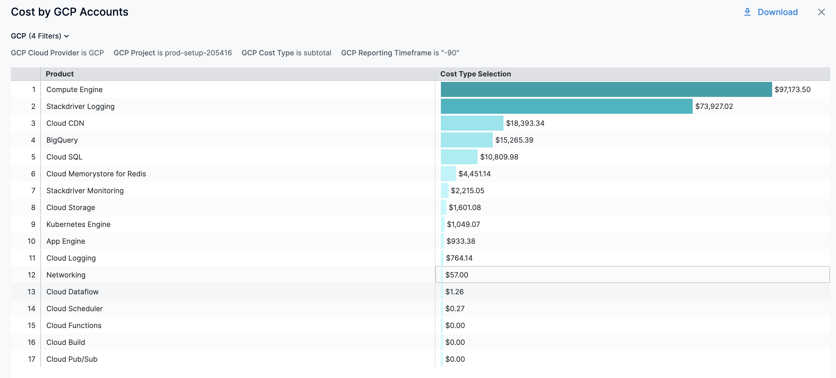 | Cost By GCP Accounts | The cost of each GCP account you are using to connect Harness to GCP via a Harness GCP Cloud Provider. |