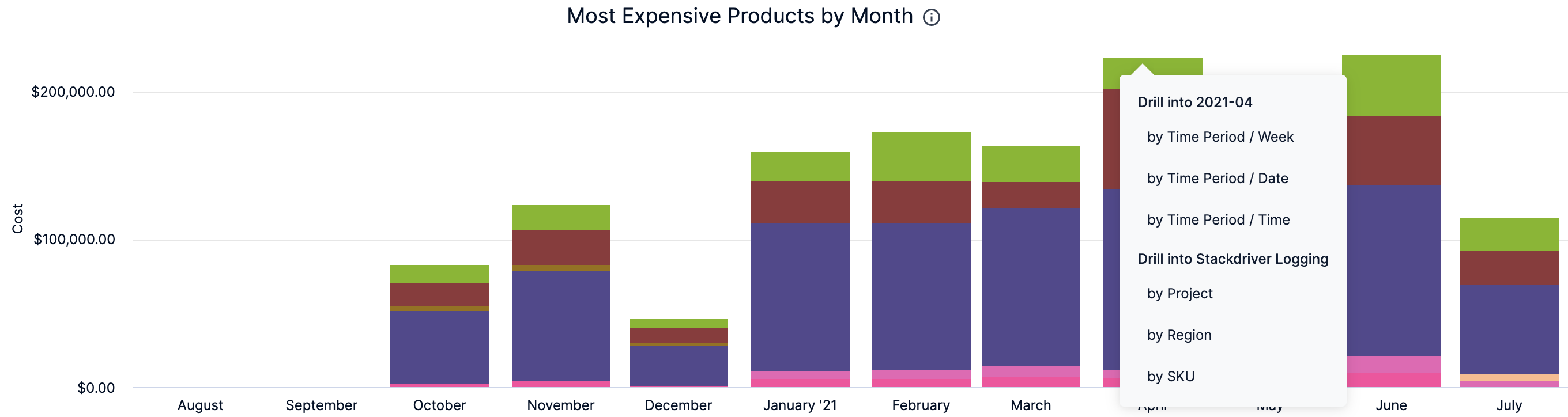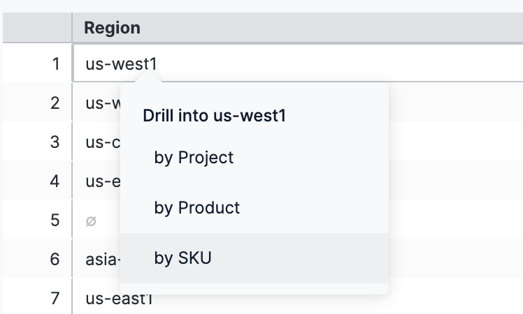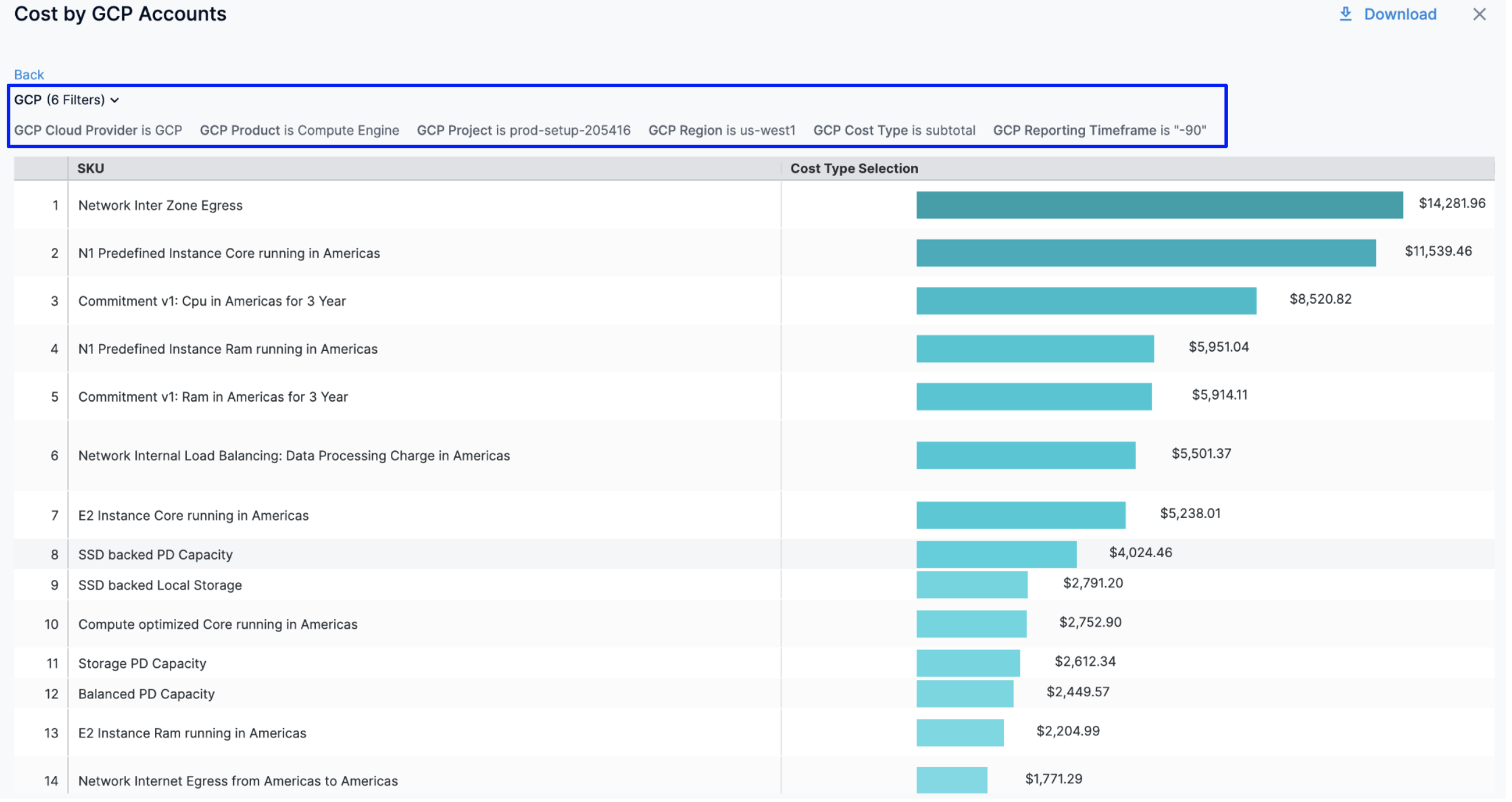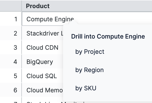 You can further drill down and view the cloud cost of a specific Product. For example, drill into Compute Engine and view the cost by Project, by Region, and by SKU.