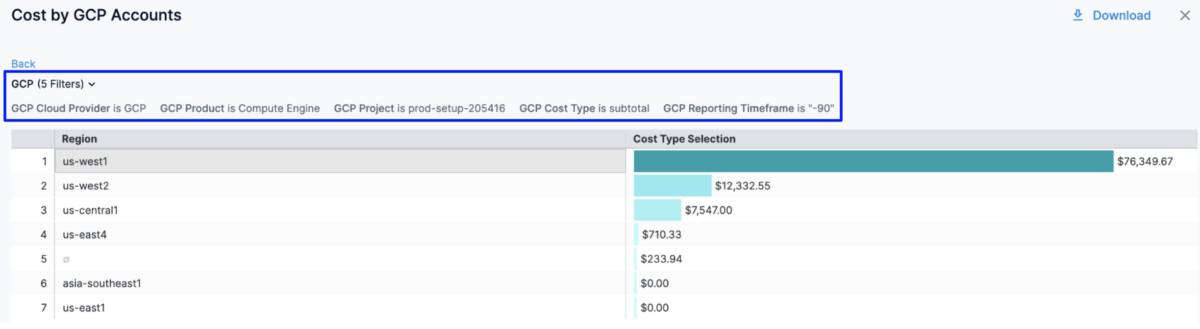 The following example displays by Region cost details in the Dashboard. You can also view the details of the filters applied.
