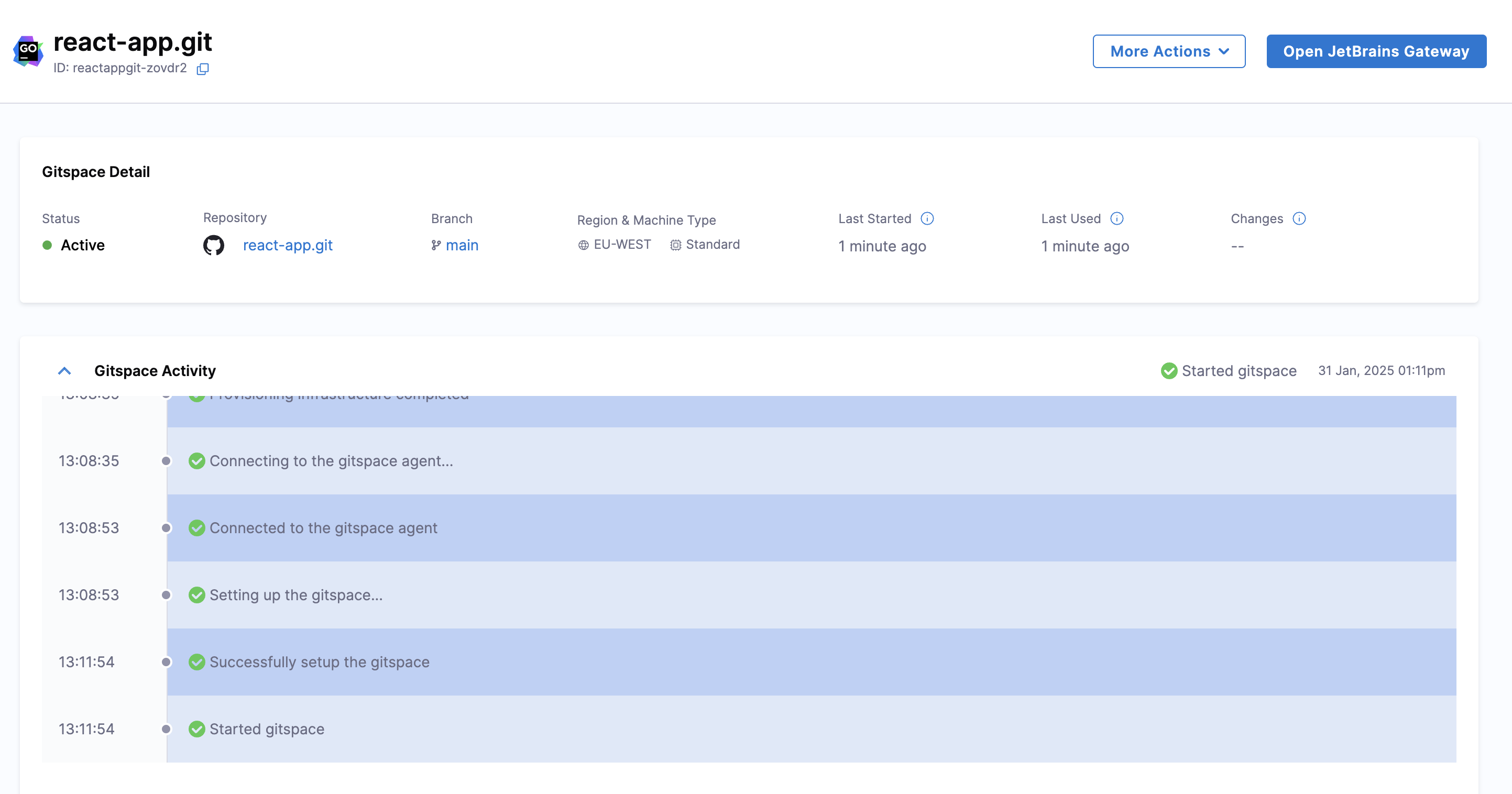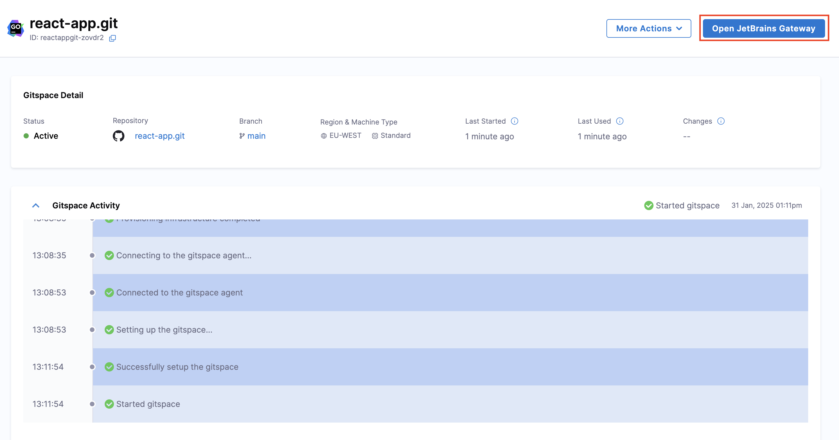 - Once the Gitspace is created and running, click on the "Open JetBrains Gateway" button.