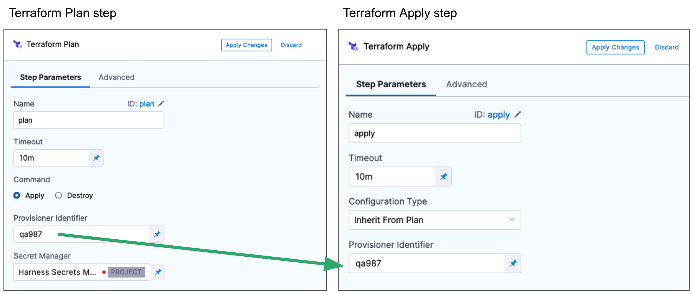 The most common use of Provisioner Identifier is between the Terraform Plan and Terraform Apply steps. For the Terraform Apply step, to apply the provisioning from the Terraform Plan step, you use the same Provisioner Identifier.