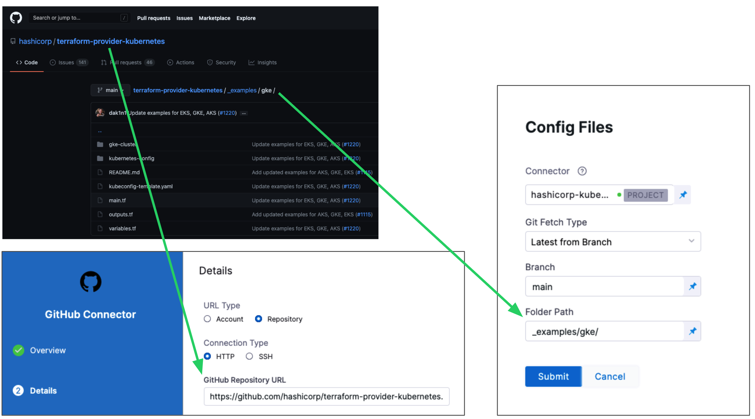 Select or create a Connector for your repo. For steps, see Connect to a Git Repo or Artifactory Connector Settings Reference (see Artifactory with Terraform Scripts and Variable Definitions (.tfvars) Files).