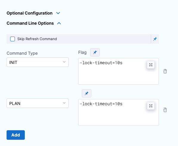 This setting allows you to set the Terraform CLI options for Terraform commands depending on the Terraform step type. For example: -lock=false, -lock-timeout=0s.