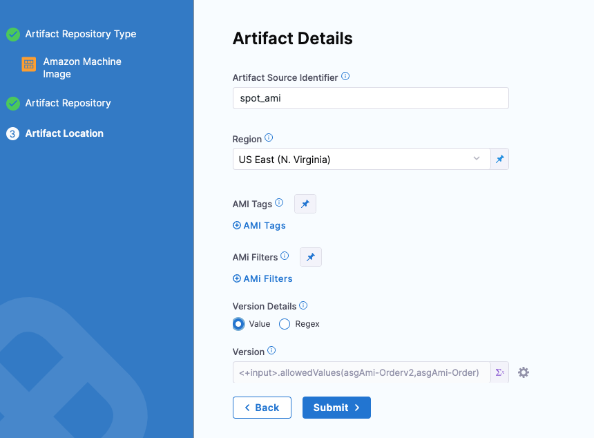 In Specify Artifact Repository Type, select Amazon Machine Image, and then select Continue. importantSpot Elastigroup deployments support AMI artifacts only.