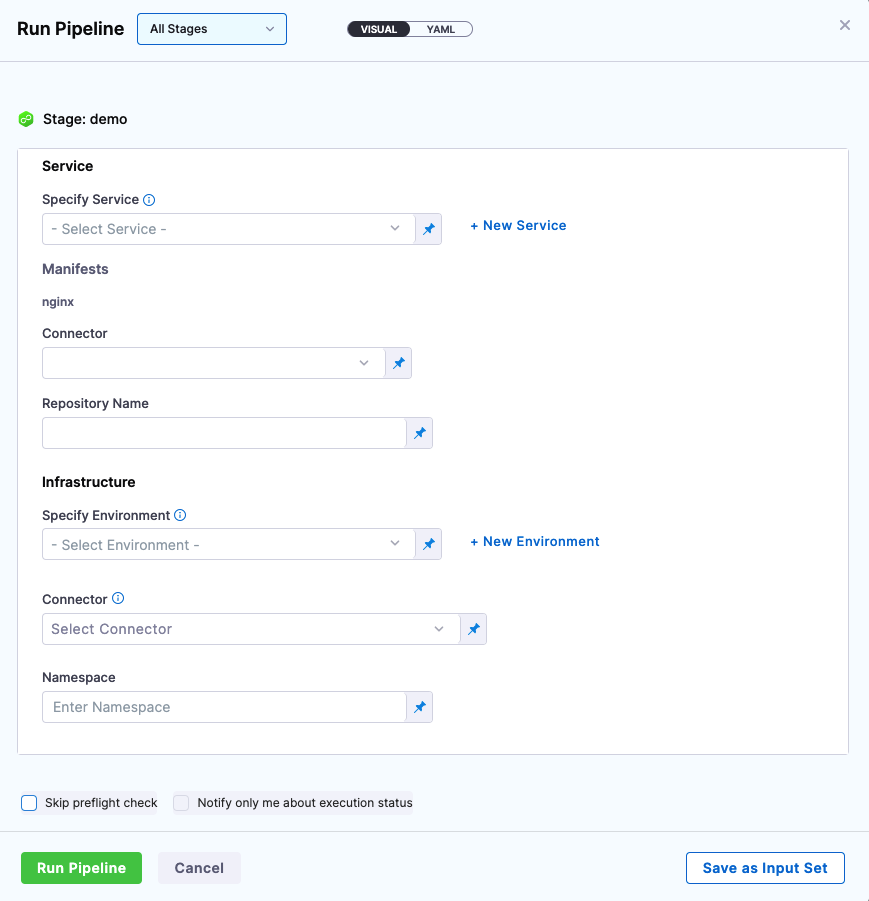 • Pipelines are triggered manually in the Harness Manager or automatically in response to Git events, schedules, new artifacts, and so on.