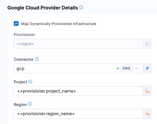 In Google Cloud Provider Details, enable the option Map Dynamically Provisioned Infrastructure. A Provisioner setting is added and configured as a runtime input.