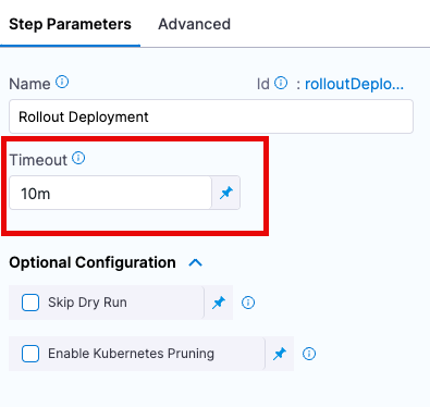 When setting step Timeout settings, it's important to know that Kubernetes itself also has an optional deadline parameter that specifies the number of seconds you want Kubernetes to wait for your Deployment to progress before the system reports back that the Deployment has failed progressing.