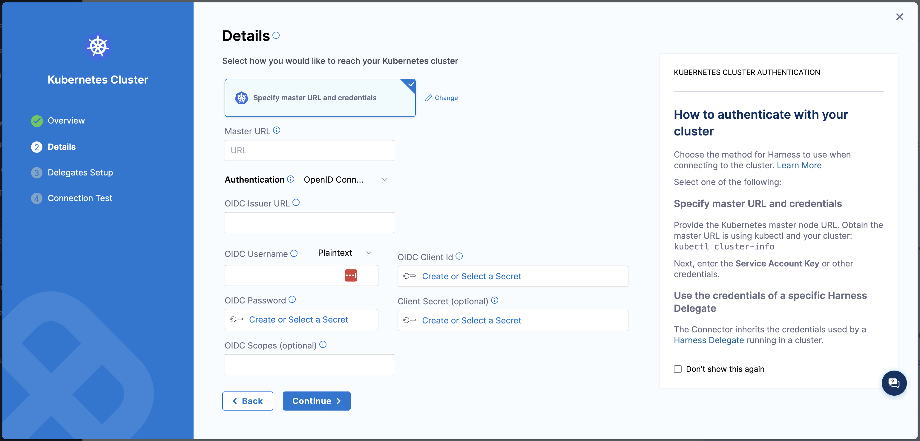 - In Cluster Details, select or add a Harness Kubernetes Cluster connector.