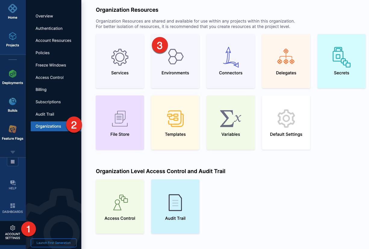 To create a service at an account or organization level, go to Organization Resources >Services.