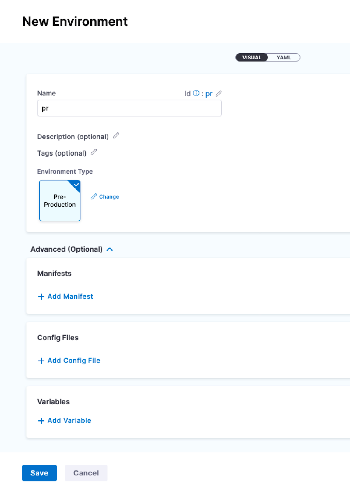 You can also set default manifests, specifications, config files, and variables to use whenever Harness deploys a service to this environment.
