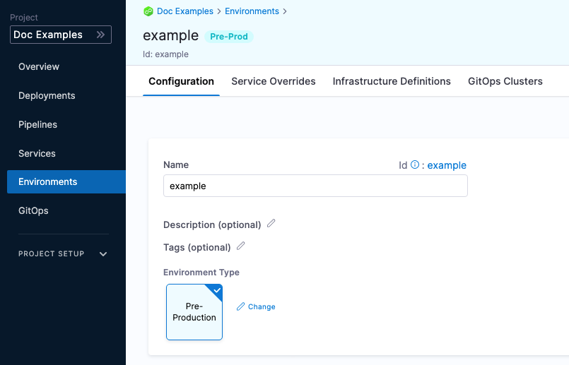 In the environment Configuration, you can manage the Name, Description, Tags, and Environment Type of the environment.