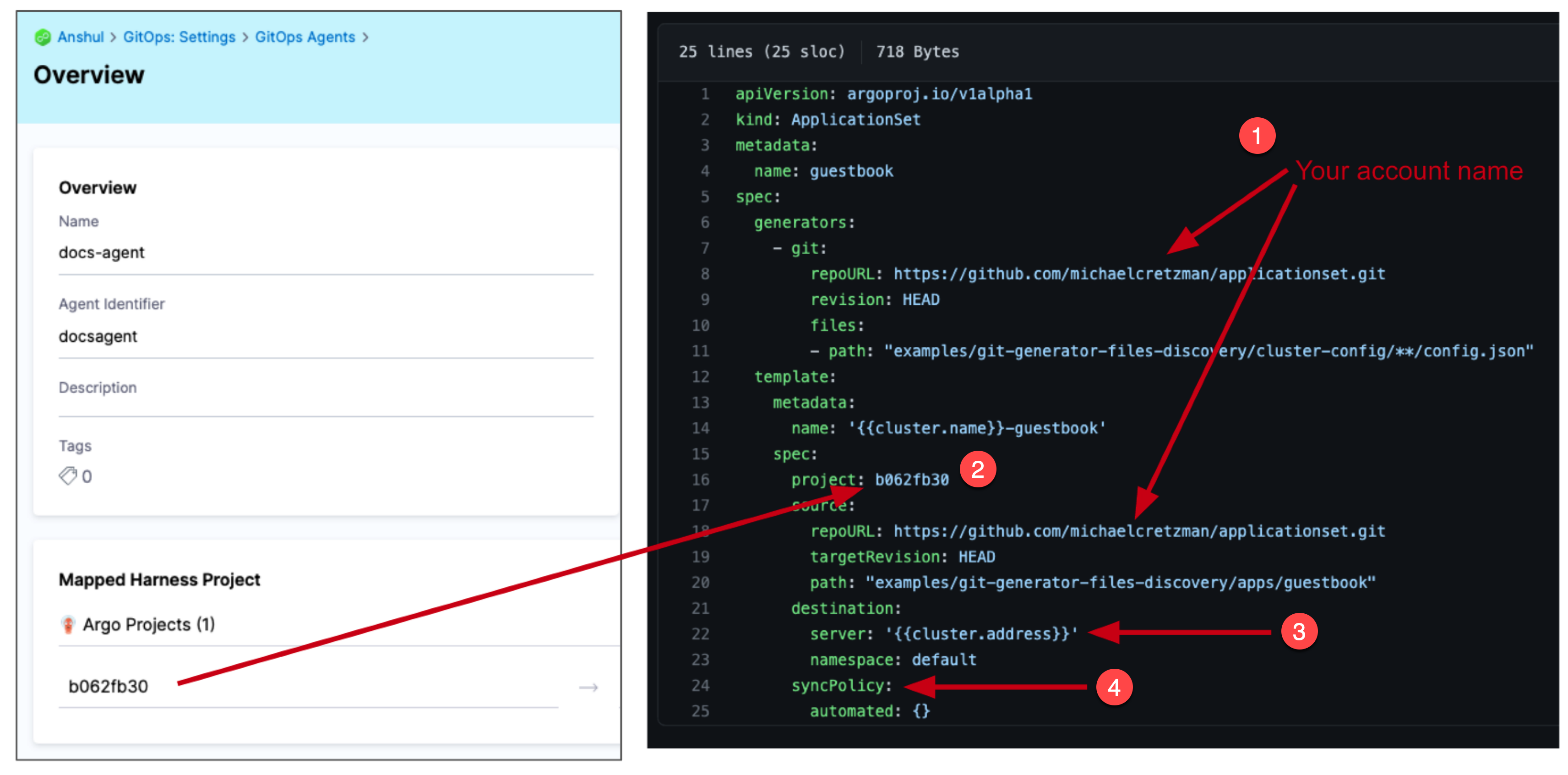 automated: {}To get the project Id, go to GitOps Agents and find the Argo Project Id you want to use to create the ApplicationSet.