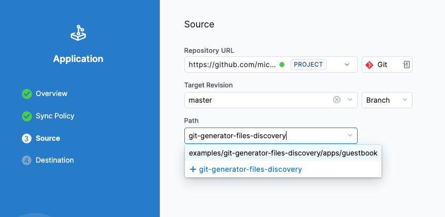 In Source, enter the following settings and then select Continue. - Repository URL: select the GitOps repository you added earlier.