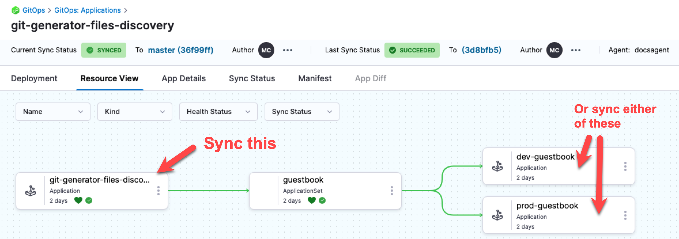 You can sync from 2 places: Application view or PR pipeline. For syncing via the PR pipeline, please refer to Sync GitOps applications.