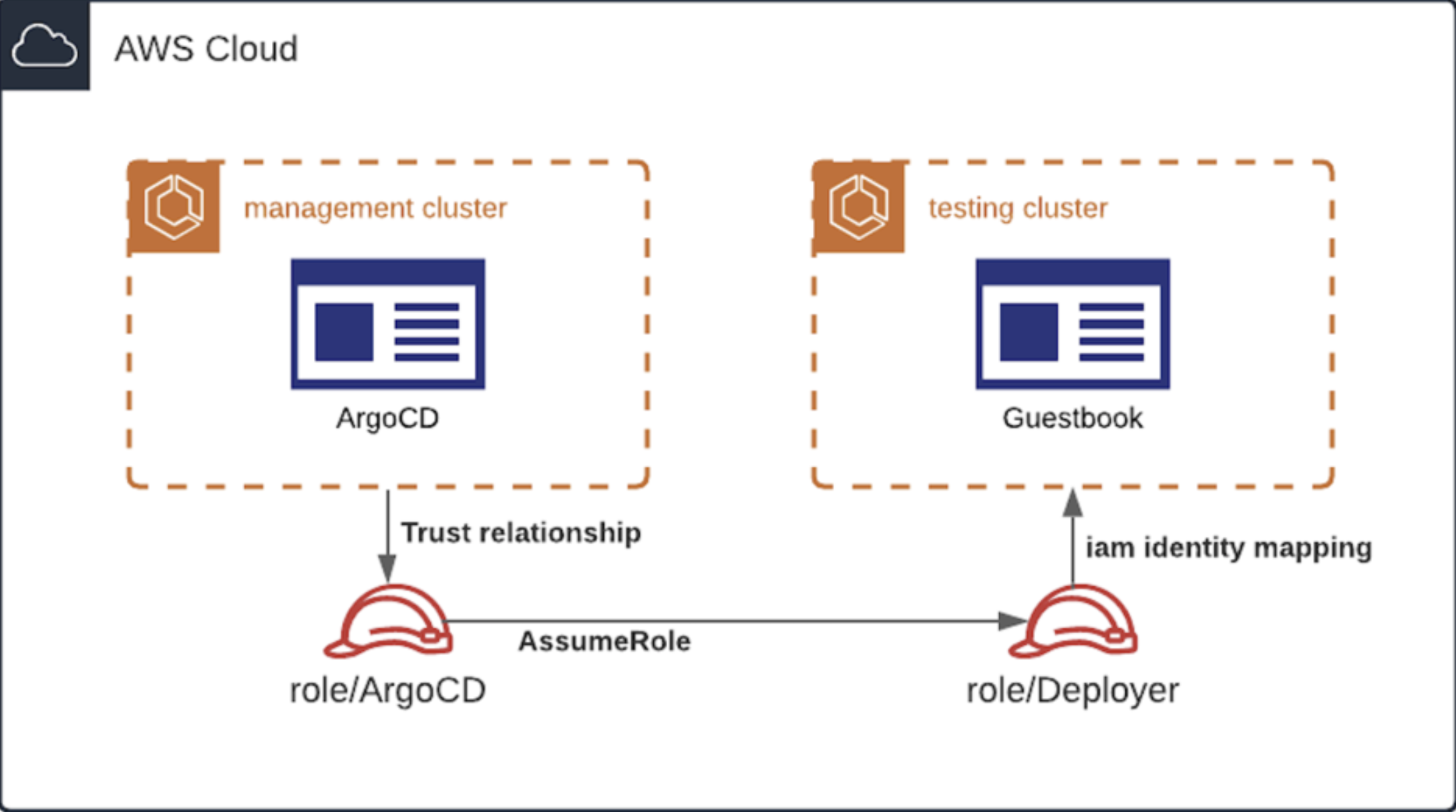Create a trust relationship for the ArgoCD role so that it can assume the Deployer role. infoIn a multi account setup, you can change the trust relationship to reference the ArgoCD role in the account that holds the management cluster, and place the Deployer role in the same account as the testing cluster. read -r -d '' TRUST_TESTING <<EOF