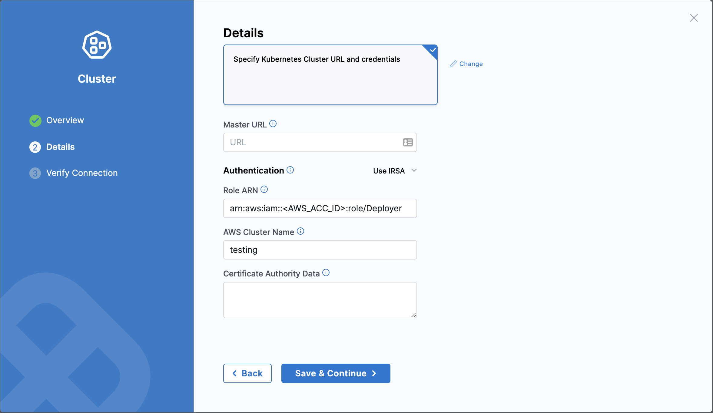 - Certificate Authority Data: Enter the corresponding public certificate of the Kubernetes API.