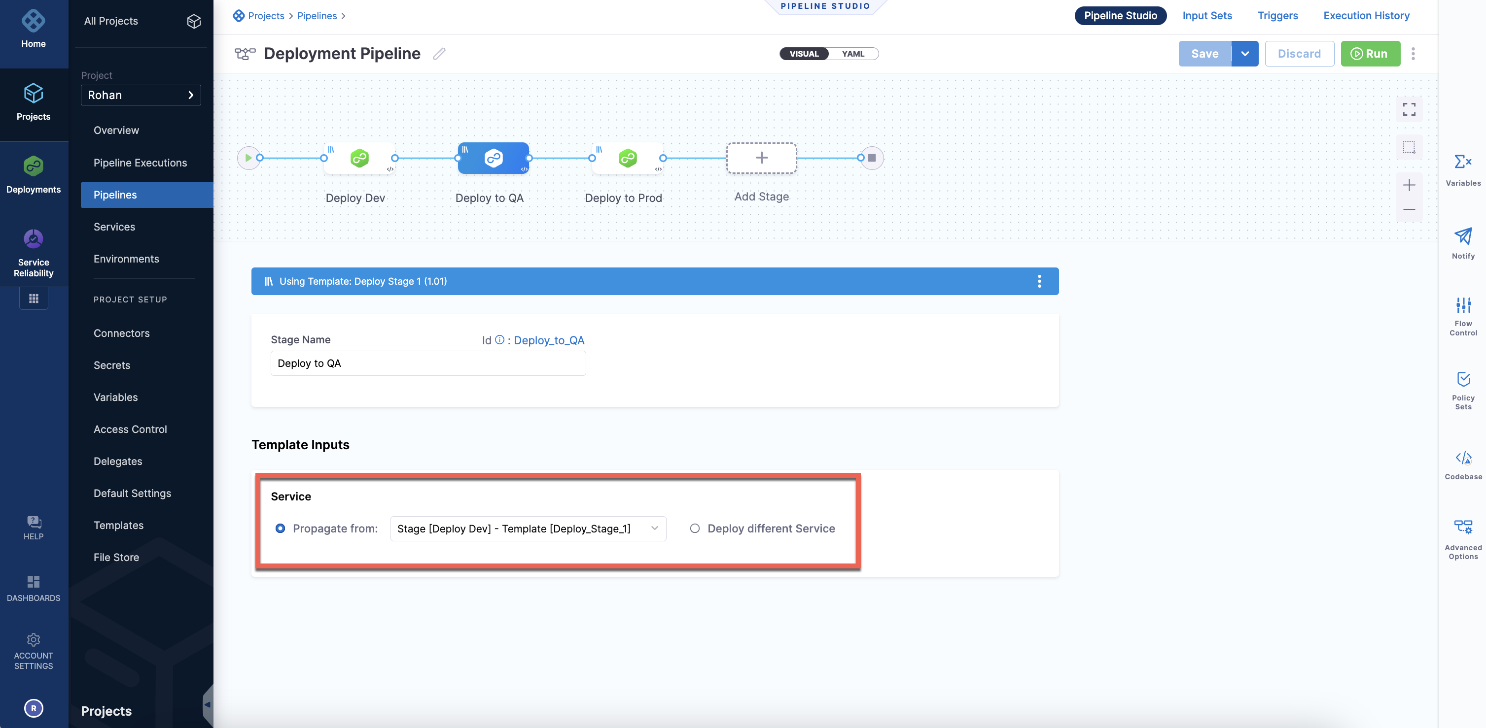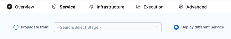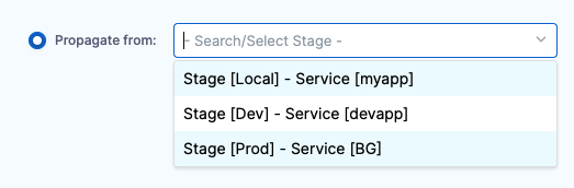 Select Propagate from and then select the stage with the service you want to use. You can see the stage name and service name.  You can also propagate a service from one template stage to another if it is a runtime input.
