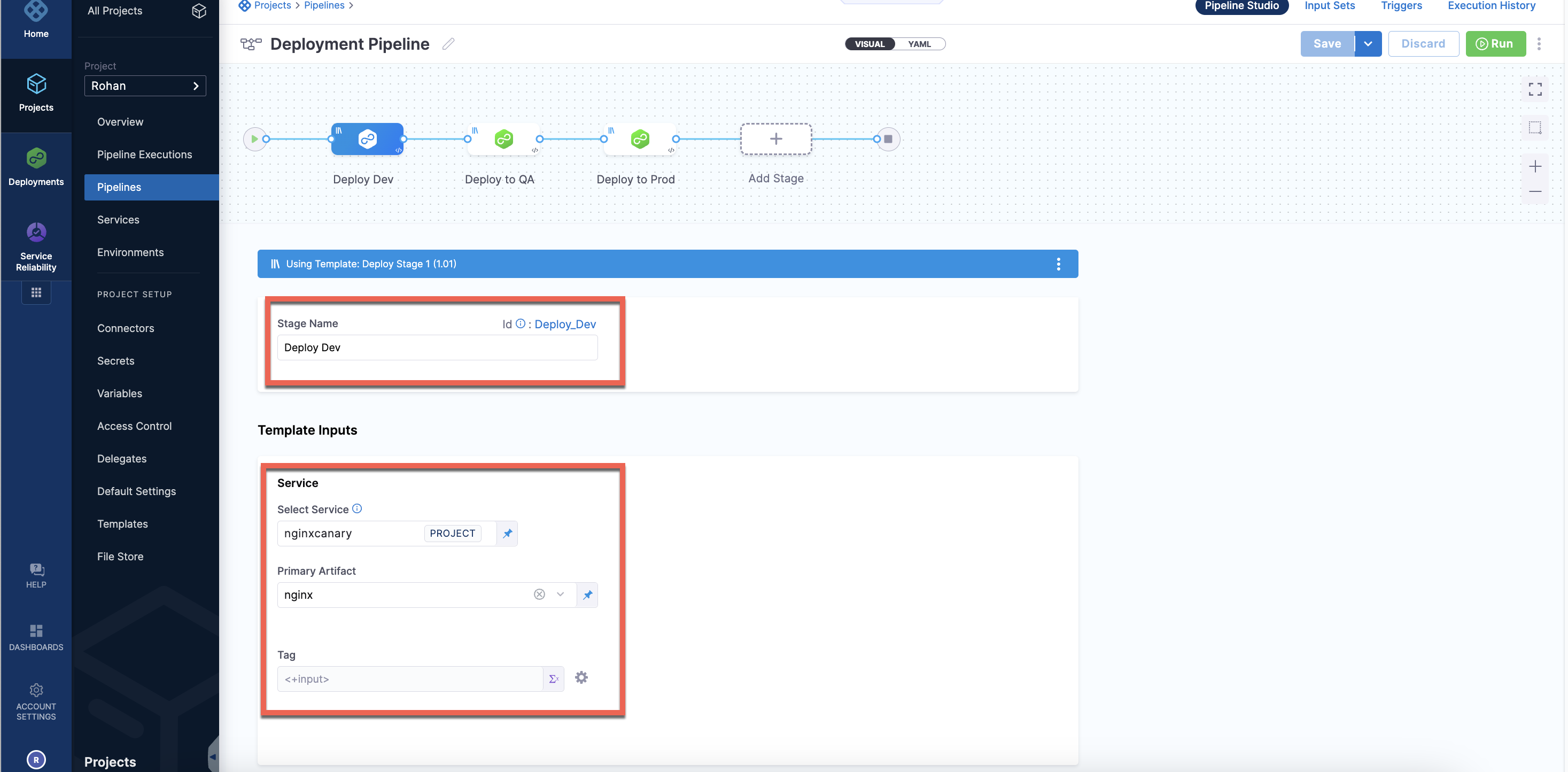 - In a pipeline's Advanced Options, in Stage Execution Settings, you can set up selective stage executions. This allows you to select which stages to deploy at runtime.