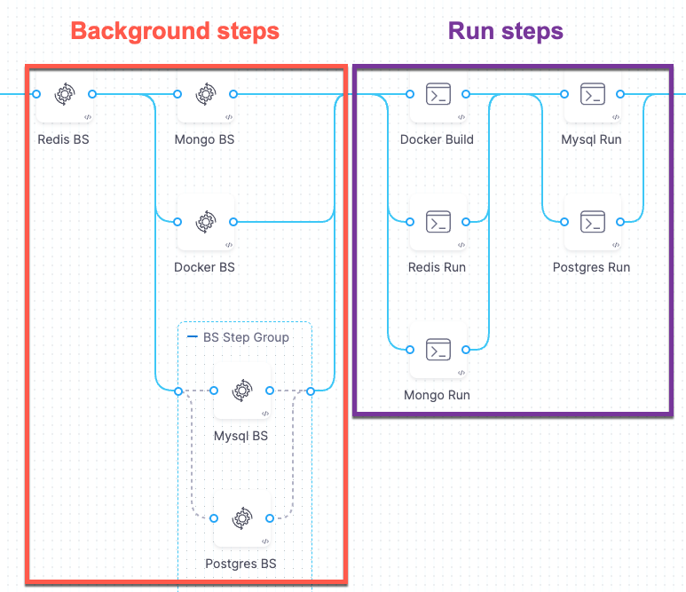 Use Background steps to manage dependent services that need to run for the entire lifetime of a Build stage. For example, you can set up your pipeline to run multiple background services that implement a local, multi-service app.