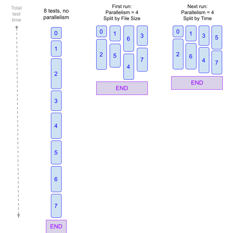 - --split-by file_timing: (Default) Split tests into groups based on the test times of individual files.- split_testsuses the most recent timing data to ensure that all parallel test runs finish at approximately the same time. This strategy requires timing data from the previous run. If timing data isn't available,- split_testsfalls back to- --split-by file_size.