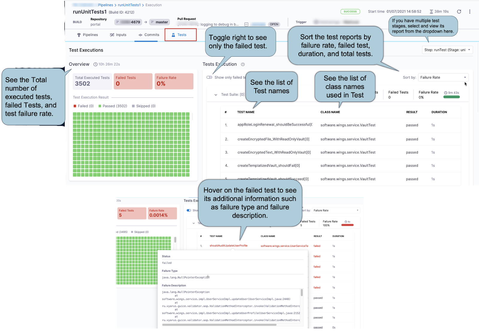 If you used a Run step, the Tests tab contains information about the total number of tests, the failure rate, and a list of failed tests. You can hover over individual failed test to view additional details about the failure.