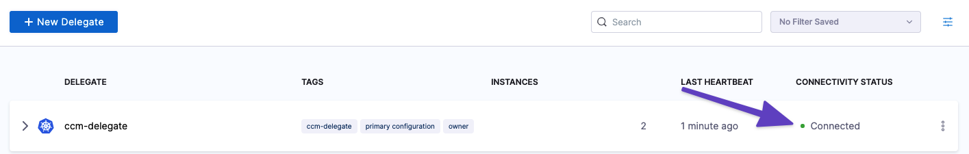 In the Harness UI, verify that the delegate appears in the delegates list. It might take two or three minutes for the Delegates list to update. Make sure the Connectivity Status is Connected. If the Connectivity Status is Not Connected, make sure the Docker host can connect to https://app.harness.io.