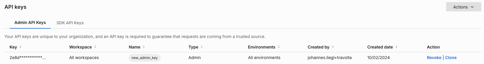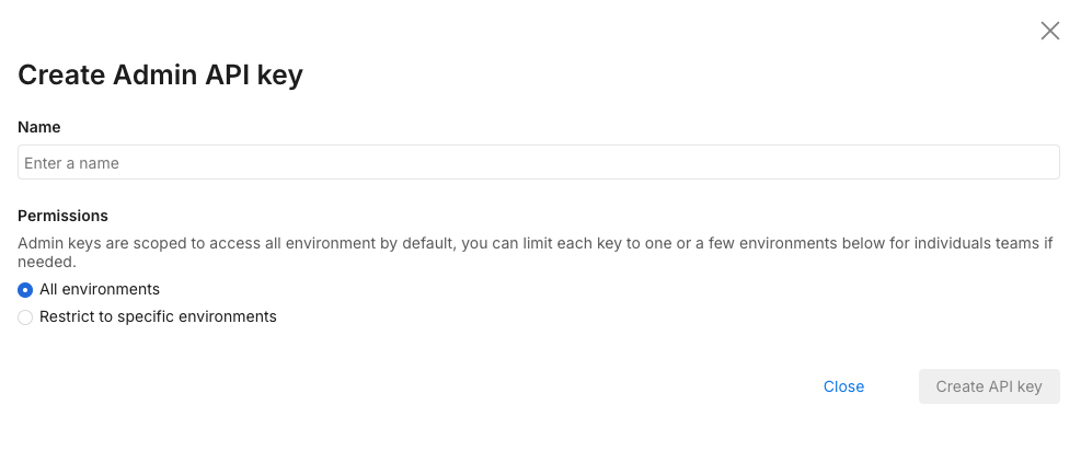 You need to create an Admin API key. You can create this by navigating to Admin settings and then API keys. Click the Action button and from the menu list, select Create API key in the top right. The following page displays:  Select Admin as this tutorial’s API key needs to be for the Admin API. Give it a name and optionally restrict it to environments and projects that you are using the API key for. Once you click Create, an API key is available for use:
