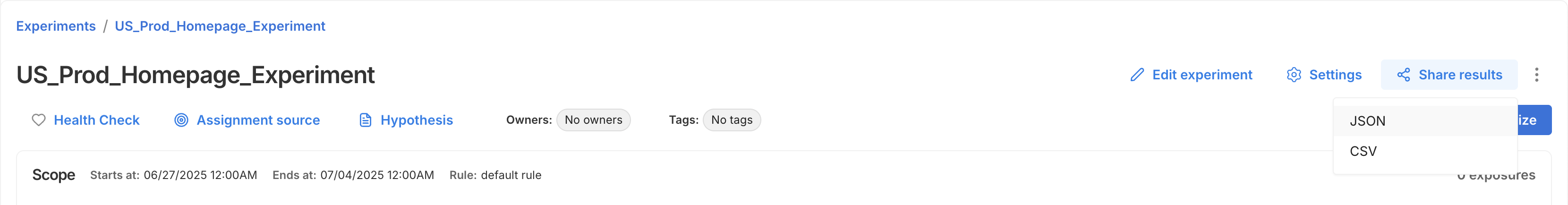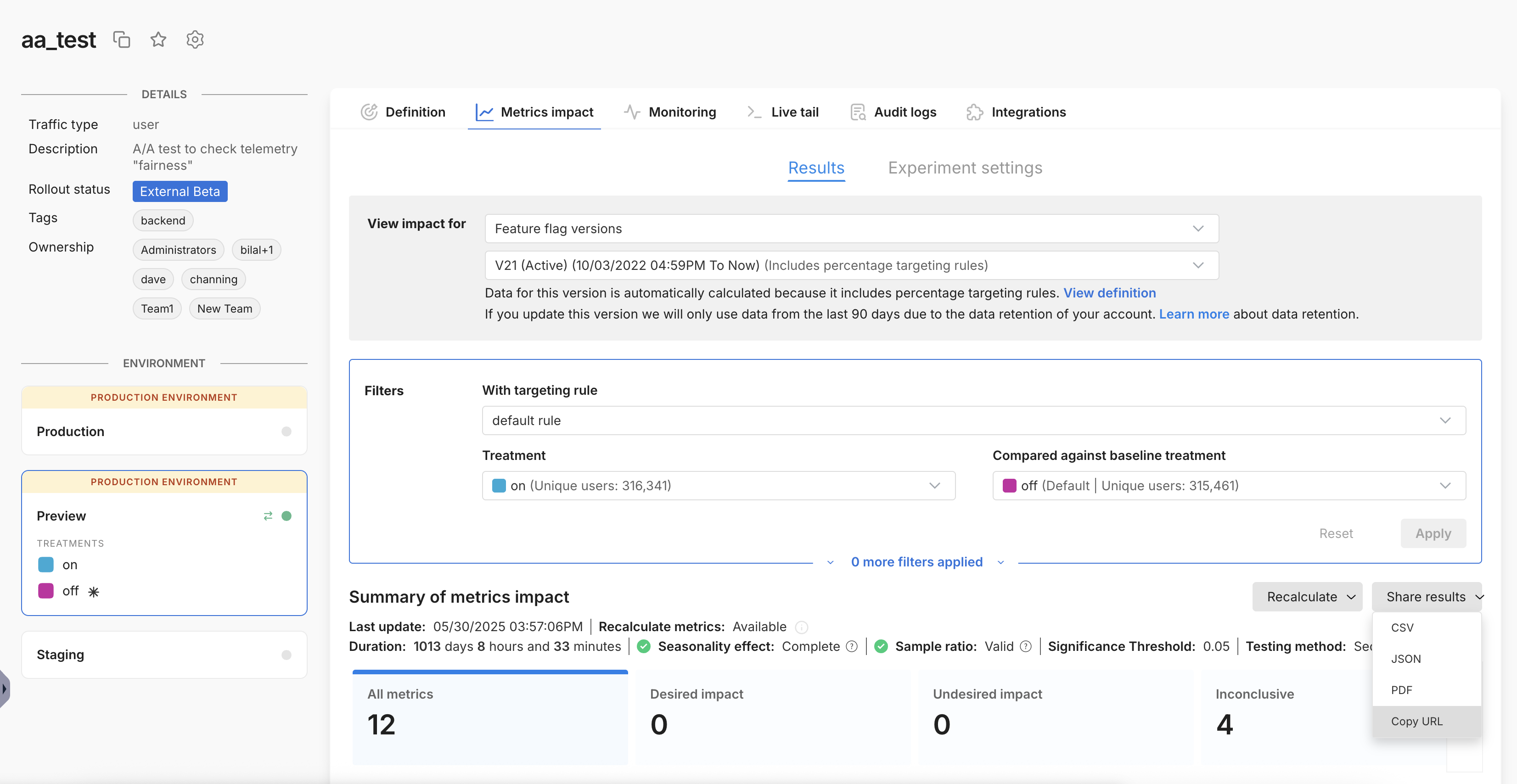 When viewing the Metrics impact tab, under Results, you can find the Share results dropdown on the right side of the page, above the metric cards.