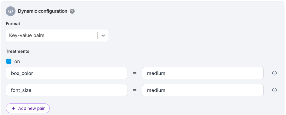 To add key-value pairs for each treatment, click Add new pair for each treatment to attach as many key-value pairs as necessary for each of your treatments. To remove a key-value, click the minus button. NoteAll keys and values are interpreted as strings when configurations are saved in this format (e.g., 5 is stringified and sent as 5) so your code needs to convert from that format at runtime.