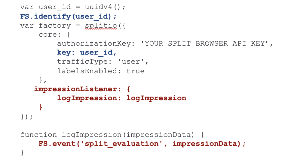 Associate the FullStory recording with the same key used for FME getTreatmentevaluations by calling FS.identify. In the listing above, the user_id is shared by the FS.identify API call and the FME SDK configuration key (shown in blue).