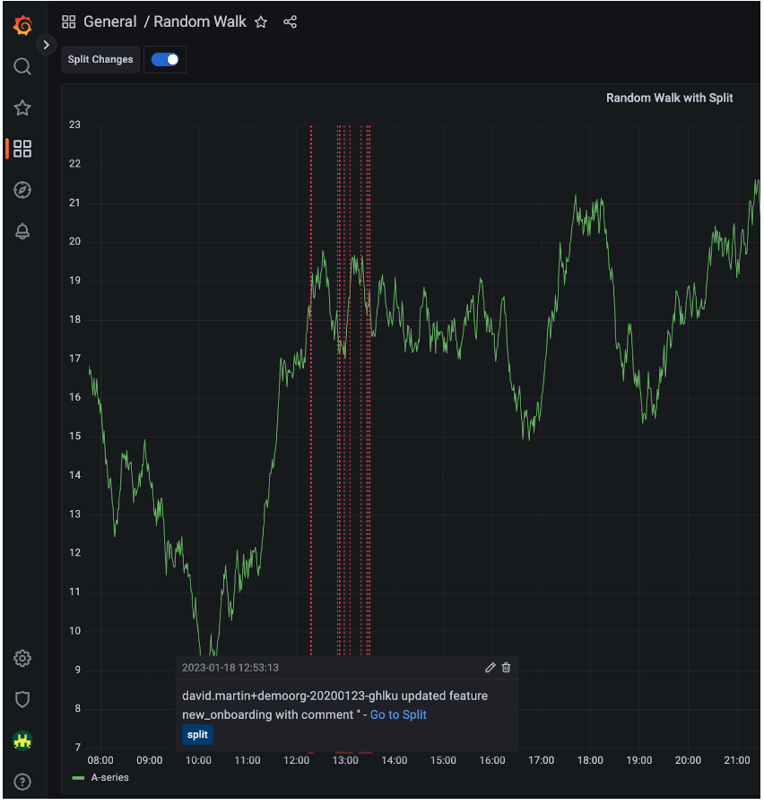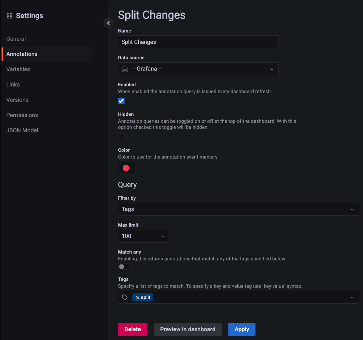 You must create an annotation query for tag 'split' on the dashboards for where you want the Harness FME annotations to appear. Refer to the Grafana documentation for information about dashboard settings. Once you set this up, you see the following: