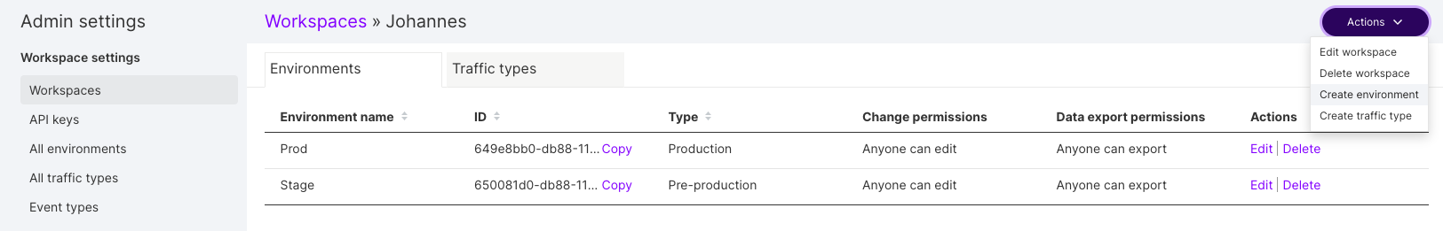 When you first create your account, you are provided with two environments. To manage your environments, go to the Projects tab in your Admin settings page. Select the project that you want to edit environments for. You can: