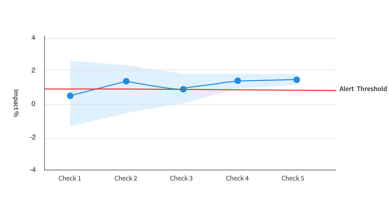 The reason no alert fires in these earlier checks is because the error margin, or confidence interval, on the impact is too wide to be confident that the impact really is greater than your threshold. However for the fourth and fifth checks, an alert would fire.