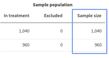 For example, imagine you see the below table for a feature flag which ran for 48 hours, and you intend to run a similar feature flag with a monitoring window length of 24 hours. To get the estimated sample size during the 24 hour monitoring window, first sum the sample sizes across the two treatments, to get 2000, then divide by 2 to go from 48 hours to 24 hours - this will give you an estimated sample size during the monitoring window of 1000.