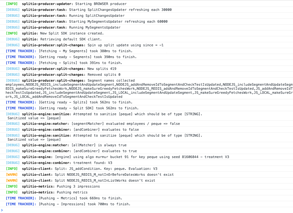 Enable SDK debug logging in the browser console: localStorage.splitio_debug = 'on';