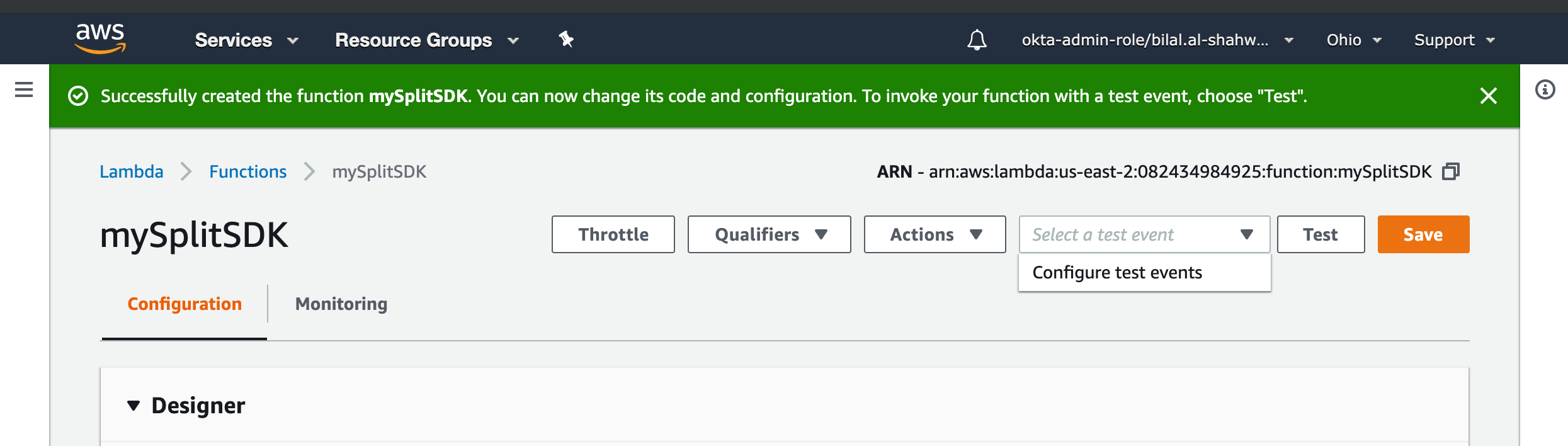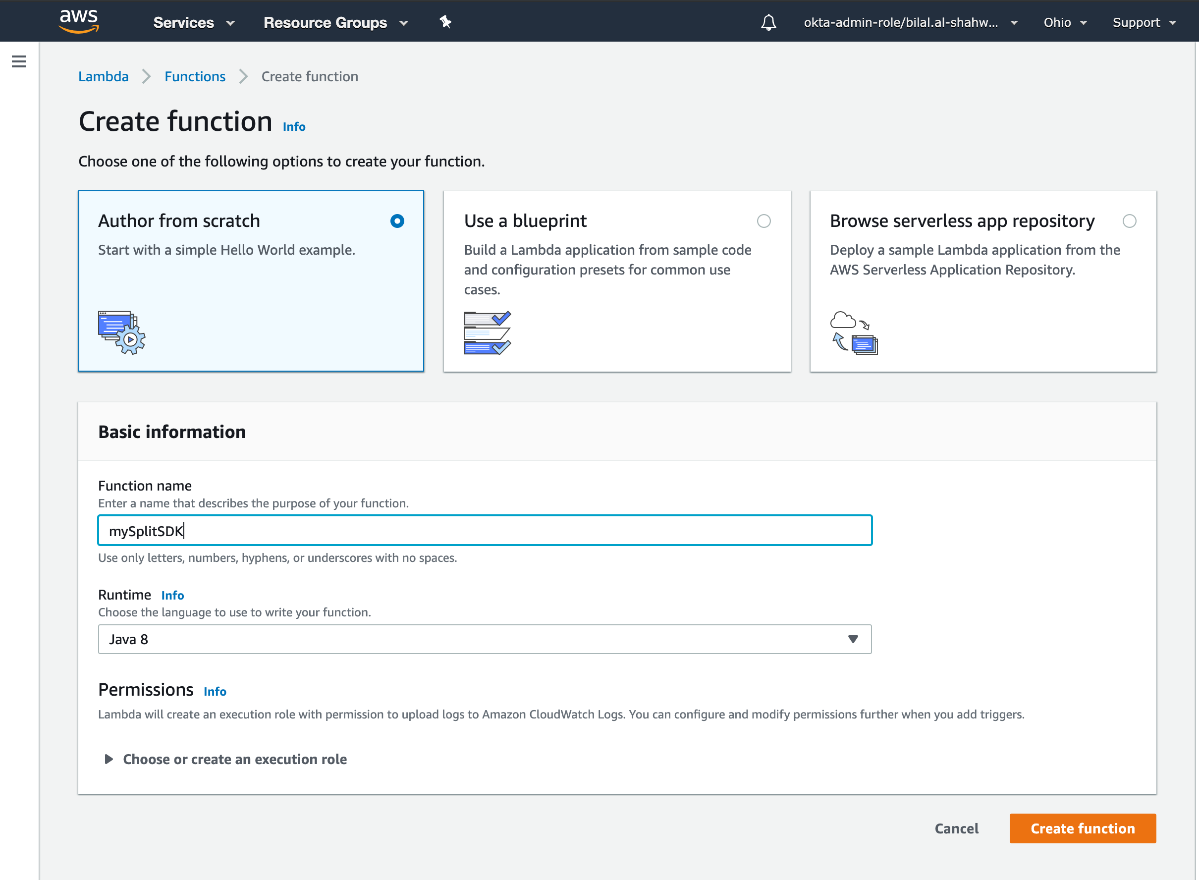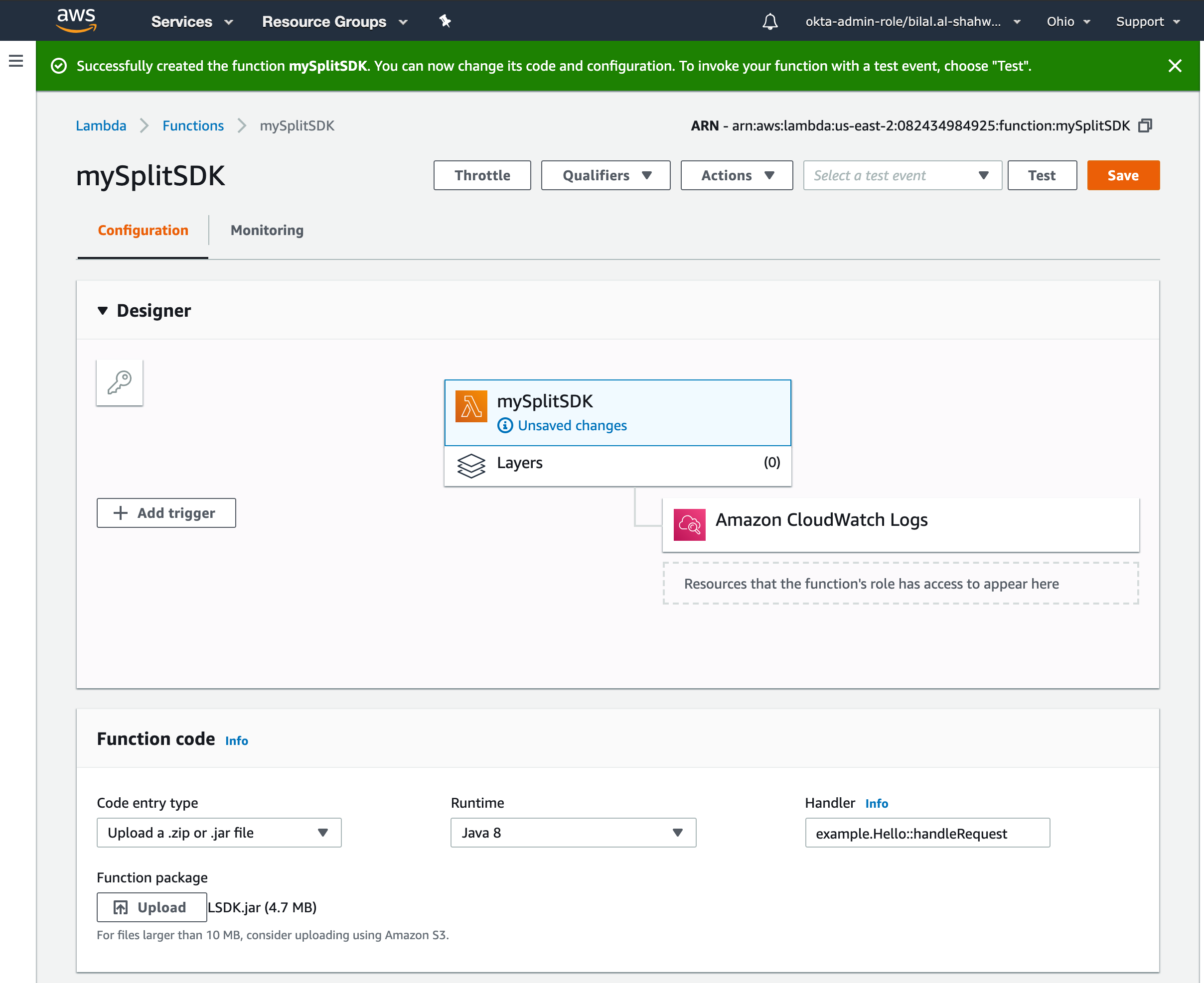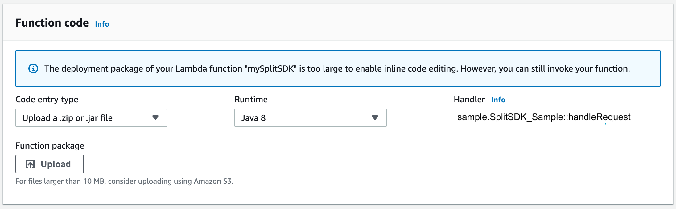 In the Function code section, set the handler to: sample.SplitSDK_Sample::handleRequest