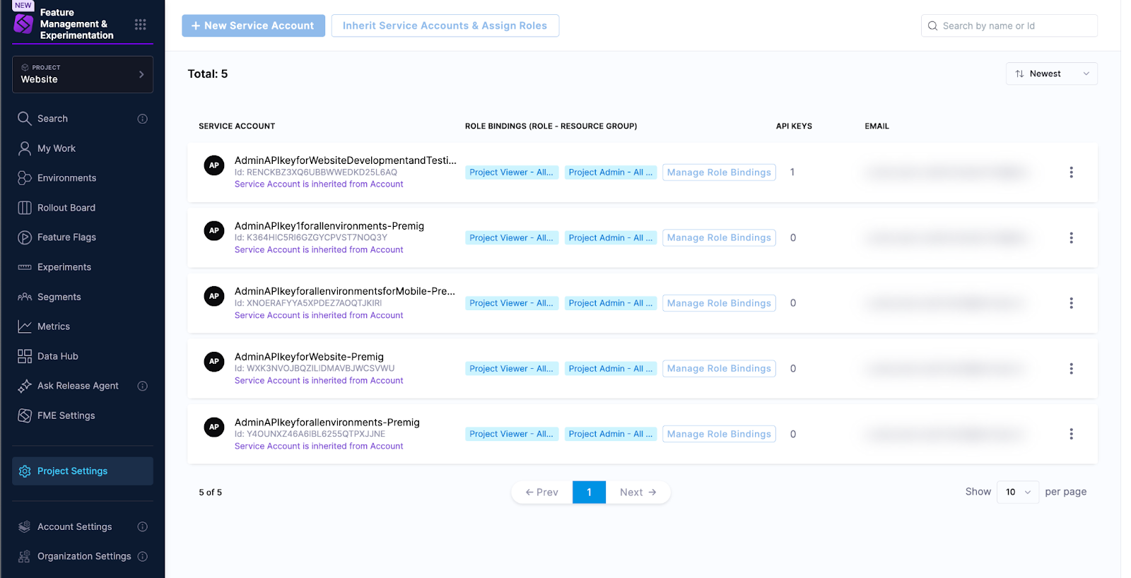 5. Under the Account or Organization tab*, click on the Harness service account corresponding to the legacy Split Admin API key (the name will match the name of the legacy key, shown in FME Settings, but without spaces).