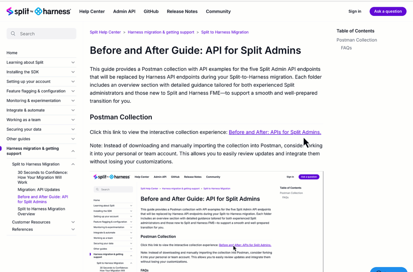 You can view the interactive collection experience Before and After: APIs for Split Admins on Postman.